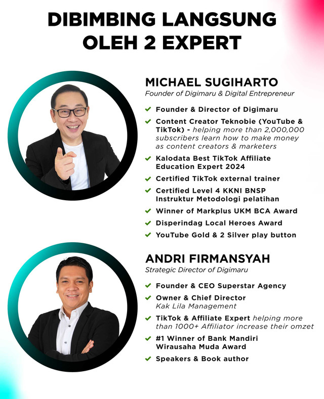 Michael Sugiharto mendedikasikan diri untuk pengembangan entrepreneurship dunia digital marketing di Indonesia. Dengan spesialiasi di bidang engagement & content marketing, Michael telah banyak melakukan pendampingan dan mentoring untuk bisnis startup di berbagai bidang. Berbagai perusahaan seperti Microsoft, XL Axiata, Lazada Academy, Skill Academy, Ninja Xpress, Vybes, Outletz.id, SMART FM, PAS FM & Merdeka FM, telah mempercayai Michael sebagai mentor digital mereka. Melirik potensi pasar digital Indonesia yang begitu masif, Michael menggagas digital startup Activomni.com yang telah membantu lebih dari 25,000 pebisnis online di Indonesia. Digimaru kini telah merangkul 14,175 lebih pemilik bisnis untuk mengelola bisnisnya secara cerdas dan tepat melalui aneka program edukasinya yang interaktif dan inspirasional. Saat ini Michael juga aktif & konsisten memberikan sharing tips, insights & inspirasi tentang bisnis online, startup & teknologi lewat YouTube channel-nya Teknobie dan Michael Sugiharto, yang sampai saat ini sudah mempunyai 1.36 juta subscribers dan 61,6 ribu subscribers serta akun Instagram @m1chaelsugih dengan 31.9 ribu followers & TikTok 51,8 ribu followers dan akun Instagram @teknobiechannel 30.6 ribu followers & TikTok 699,4 ribu followers.